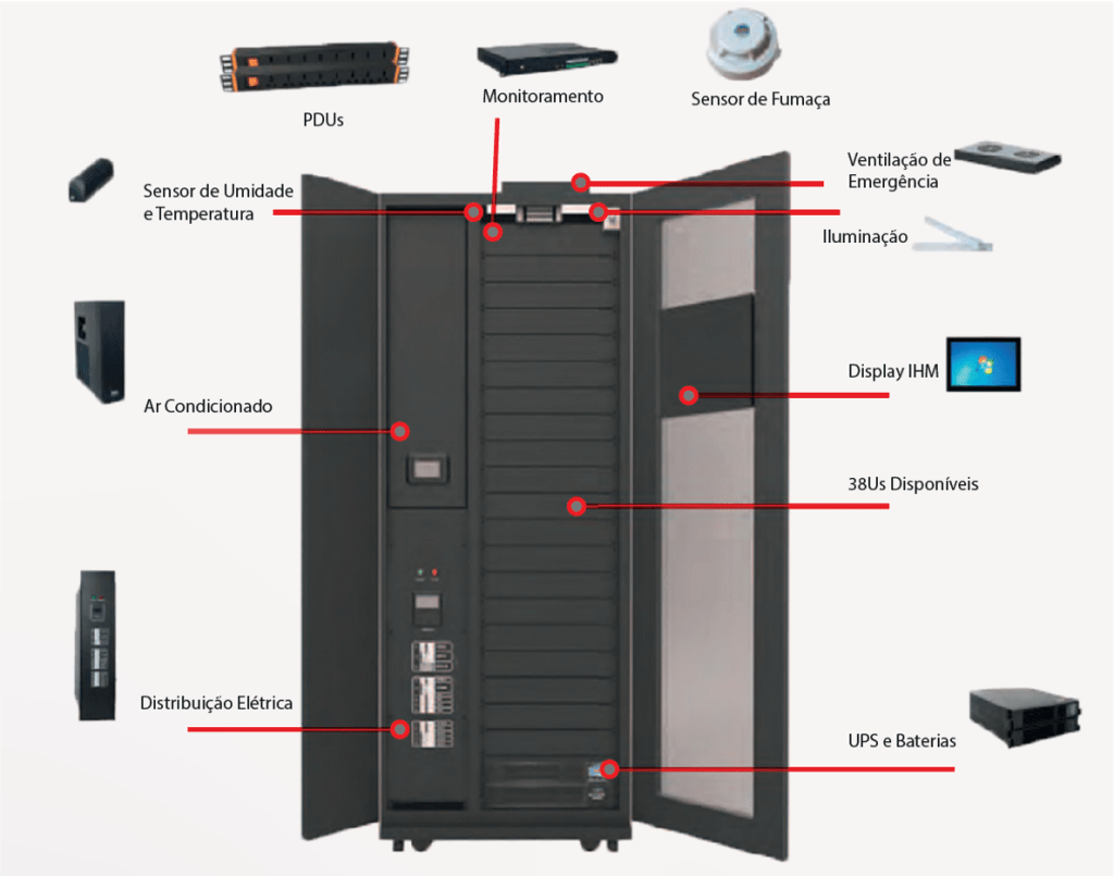 - Design integrado de rack, com ar condicionado, UPS , sistema de energia